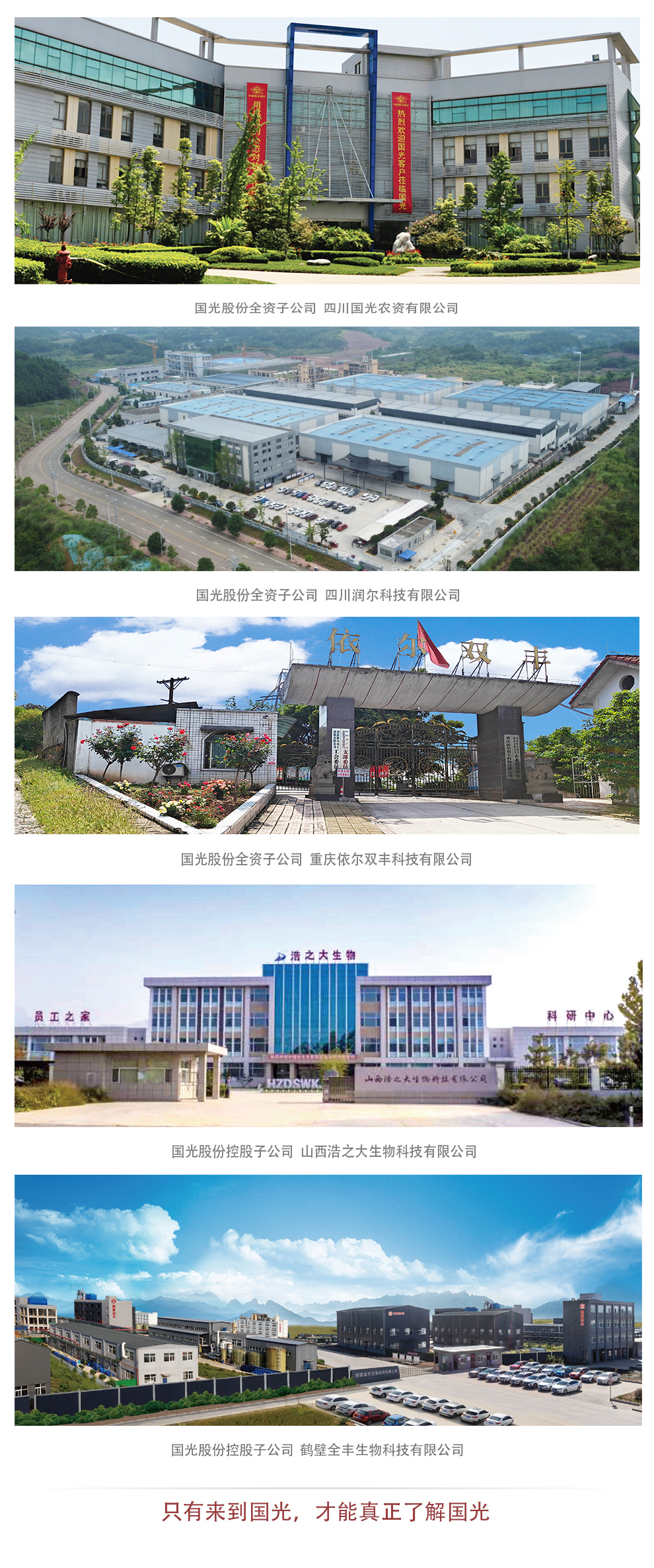 公司下屬的四川國(guó)光農(nóng)資有限公司、四川國(guó)光園林科技有限公司、四川潤(rùn)爾科技有限公司、重慶依爾雙豐科技有限公司、山西浩之大生物科技有限公司、鶴壁全豐生物科技有限公司、四川蕓領(lǐng)農(nóng)業(yè)技術(shù)服務(wù)有限公司、成都國(guó)光現(xiàn)代農(nóng)業(yè)職業(yè)技能培訓(xùn)學(xué)校有限公司等十五家公司分布于四川省、山西省、河南省、海南省、重慶市等。ㄖ陛犑校,并在全國(guó)設(shè)有二十五個(gè)物流倉(cāng)儲(chǔ)服務(wù)中心。公司堅(jiān)持“敬業(yè)、高效、務(wù)實(shí)、創(chuàng)新”的企業(yè)精神,聚焦調(diào)節(jié)劑、水溶性肥料、園林養(yǎng)護(hù)品等優(yōu)勢(shì)品類,堅(jiān)持“全員服務(wù)、創(chuàng)造價(jià)值;全心服務(wù),成就用戶”的服務(wù)理念,突出技術(shù)服務(wù)的核心作用,產(chǎn)品在配合綠色防控、提質(zhì)減量、抗災(zāi)減害、減少人工、配合機(jī)械化等方面起著重要作用,“國(guó)光”“雙豐”“浩之大”“國(guó)光園林”“鶴壁全豐”品牌影響力持續(xù)擴(kuò)大。