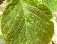 獼猴桃病毒病有獼猴桃花葉病。。表現(xiàn)為葉部有鮮黃色不規(guī)則線(xiàn)狀或片狀斑,病健部交界明顯,葉脈和脈間組織均可以發(fā)病,嚴(yán)重影響葉片的光合功能。