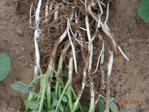 試驗(yàn)背景:隨著馬鈴薯面積的擴(kuò)大,連作障礙土傳性病害越來越嚴(yán)重,特別是像黑痣病、枯萎病近2年發(fā)生特別嚴(yán)重,而且治療非常困難。市面上防治這類病害的藥劑效果好的很少。2014年由于前期地溫比較低、濕度大,黑痣病感染比較嚴(yán)重,有的甚至已經(jīng)感染匍匐莖,嚴(yán)重影響到馬鈴薯的生長。