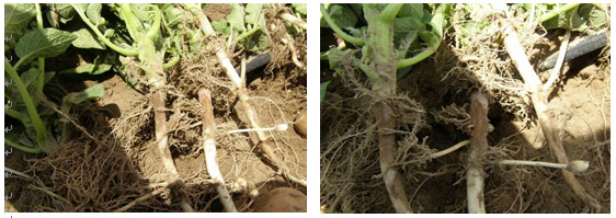 黑痣病又稱立枯絲核菌病、莖基腐病、絲核菌潰瘍病、黑色粗皮病,是以帶病種薯和土壤傳播的病害。莖上發(fā)病首先在近地面處產(chǎn)生紅褐色長形病斑,后逐漸擴(kuò)大,莖基部周圍變黑而表皮腐爛。因輸導(dǎo)組織被破壞,葉片逐漸枯黃卷曲,植株易傾斜倒伏死亡。地下塊莖發(fā)病多以芽眼為中心,生成褐色病斑,其后干腐或瘡痂狀龜裂,薯塊小而不光滑。溫度低濕度大時,病株表面著生白色霉?fàn)钗,造成部分死亡?/span>