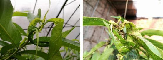 蚜蟲(chóng)主要為害桃樹(shù)幼嫩枝葉,春季當(dāng)桃樹(shù)發(fā)芽展葉時(shí),蚜蟲(chóng)聚集桃樹(shù)嫩枝和新葉上,用細(xì)長(zhǎng)的口針刺入植物組織內(nèi)部吮吸汁液,桃葉受害后呈現(xiàn)黑點(diǎn)、紅色或黃色斑點(diǎn),葉卷曲皺縮,導(dǎo)致葉片干枯或提前脫落,嚴(yán)重影響桃樹(shù)枝葉正常生長(zhǎng)。同時(shí)蚜蟲(chóng)排泄的蜜露、污染葉面及枝梢,使桃樹(shù)生理活動(dòng)受阻,常造成煙煤病,同時(shí)加速桃葉早期落葉。