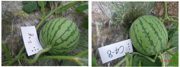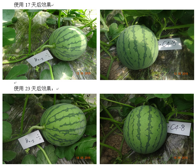 2015年4月,我們江西瑞金武陽鎮(zhèn)帥童無籽瓜上做了國光座瓜靈(0.1%氯吡脲)提高西瓜坐瓜率試驗示范。試驗結果表明:在西瓜雌花開放當天,用國光座瓜靈10毫升兌水1.5-2公斤,噴施瓜胎正反面,可明顯提高西瓜坐果率,用藥的西瓜生長良好,果型端正。