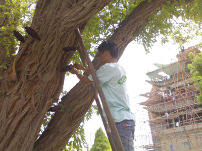 據(jù)駐寺學(xué)員納新輝介紹,2004年之前兩棵槐樹年年開(kāi)花,2004年之后卻突然沒(méi)了動(dòng)靜,大家都以為它們要“不行了”。 2011年,永寧縣林業(yè)局派專家前來(lái)為老樹“看病”并開(kāi)出“處方”。經(jīng)過(guò)三年多“治療”和“休養(yǎng)”,兩棵百年古槐再次鮮花怒放,恢復(fù)了往夕風(fēng)采,成為納家戶一道靚麗風(fēng)景。
