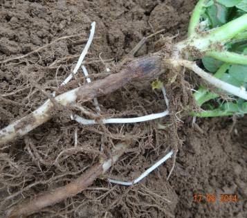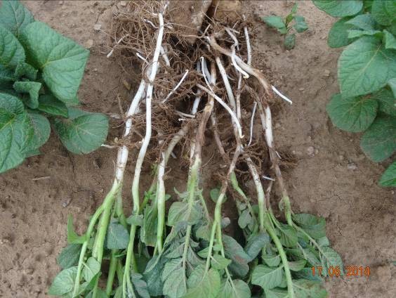 試驗(yàn)背景:隨著馬鈴薯面積的擴(kuò)大,連作障礙土傳性病害越來越嚴(yán)重,特別是像黑痣病、枯萎病近2年發(fā)生特別嚴(yán)重,而且治療非常困難。市面上防治這類病害的藥劑效果好的很少。2014年由于前期地溫比較低、濕度大,黑痣病感染比較嚴(yán)重,有的甚至已經(jīng)感染匍匐莖,嚴(yán)重影響到馬鈴薯的生長。