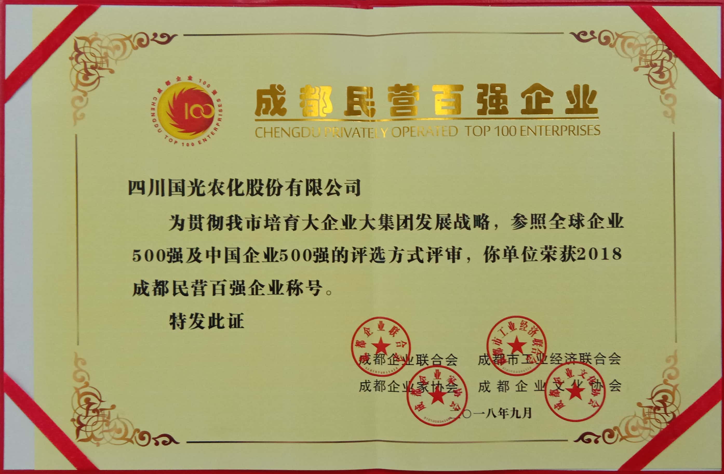 國光股份憑借優(yōu)異經(jīng)營業(yè)績和強(qiáng)勁增長勢(shì)頭,獲得“2018成都企業(yè)100強(qiáng)”榮譽(yù)稱號(hào)。