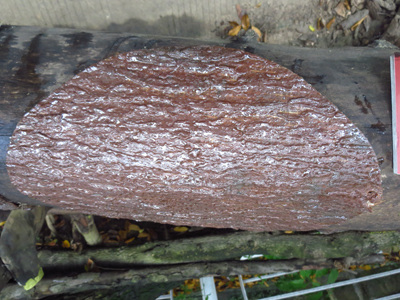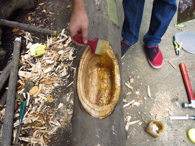 2、用ACQ木材防腐劑或熟桐油分別涂刷挖好的樹洞,一種防腐材料涂抹一半的樹洞(圖2);