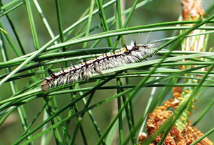 松毛蟲繁殖力強,產(chǎn)卵量大,卵多成塊或成串產(chǎn)在未曾受害的幼樹針葉上。1-2齡幼蟲有群集和受驚吐絲下垂的習(xí)性;3齡后受驚擾有彈跳現(xiàn)象;幼蟲一般喜食老葉。成蟲有趨光性,以20時活動最盛。